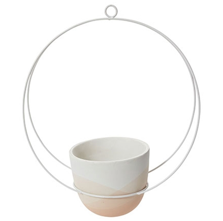 Une magnifique jardinière à suspendre pour mettre vos plantes en pots de 6 pouces préférées. Le cache-pot de céramique blanc et corail agencé au cerceau de métal blanc saura mettre en valeur vos plantes délicates dans vos décors simples.